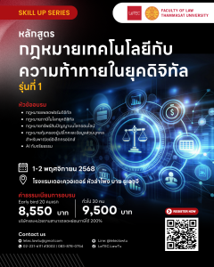โครงการอบรมหลักสูตรกฎหมายทรัพย์สินทางปัญญาสำหรับผู้ปฏิบัติงาน รุ่นที่ 1 ระหว่างวันที่ 29 พฤศจิกายน 2568 – 7 มีนาคม 2569 เวลา 09.00 – 17.30 น. (หลักสูตรจำนวน 70 ชั่วโมง) อบรมด้วยรูปแบบ Hybrid ทั้ง Online และ Onsite