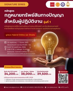 โครงการอบรมหลักสูตรกฎหมายทรัพย์สินทางปัญญาสำหรับผู้ปฏิบัติงาน รุ่นที่ 1 ระหว่างวันที่ 29 พฤศจิกายน 2568 – 7 มีนาคม 2569 เวลา 09.00 – 17.30 น. (หลักสูตรจำนวน 70 ชั่วโมง) อบรมด้วยรูปแบบ Hybrid ทั้ง Online และ Onsite